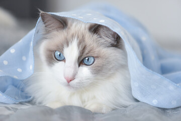 Beautiful ragdoll cat with blue eyes hiding under the scarf.
