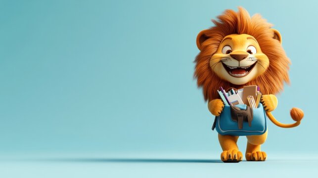 Cartoon lion carrying school bag on light blue background. Possible stock use educational illustration