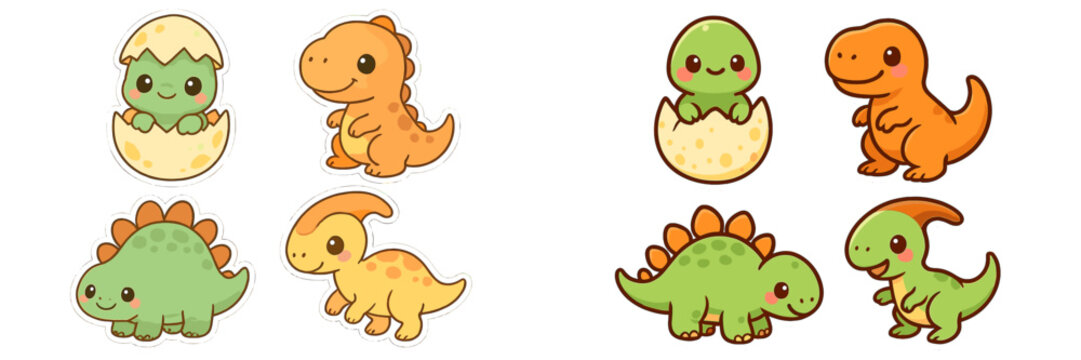 Cute dinosaur stickers show baby dinosaurs hatching and playing in a colorful design collection for children
