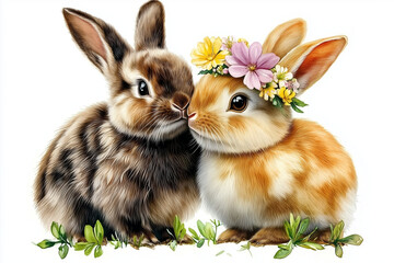 Two bunnies joyfully running, sunset meadow, bokeh background, Easter card