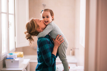 A mother holds her adorable toddler daughter and gives her a sweet kiss on the cheek. The happy child smiles and looks at the camera indoors.