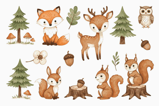 A charming watercolor illustration featuring a collection of cute woodland creatures and forest elements, perfect for children's decor.