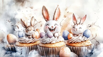delightful easter treats: close-up of pastel macarons and cupcakes with bunny and egg decorations - perfect for a festive poster in dining or café interiors!