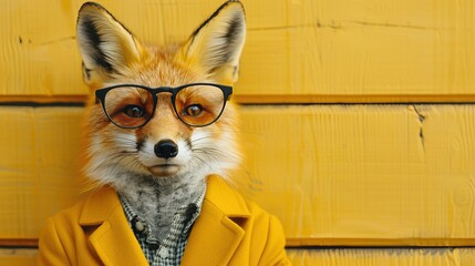 Modern fox in fashionable trendy outfit with hipster glasses and yellow business suit. Creative animal concept banner. Pastel yellow background banner with copyspace