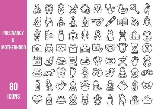 A comprehensive set of 80 line icons representing pregnancy, baby care, parenting, and maternal health in a modern flat style.