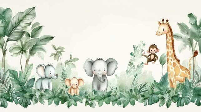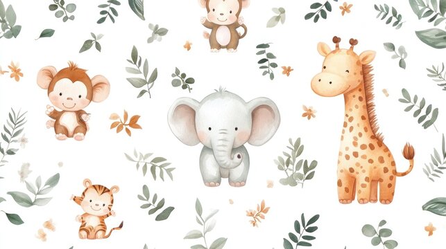 Cute jungle animals pattern, featuring monkeys, elephants, giraffes, and tigers, set against a backdrop of leaves and foliage