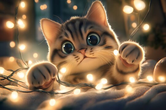 Adorable kitten batting at a string of glowing fairy lights, creating a heartwarming and playful scene