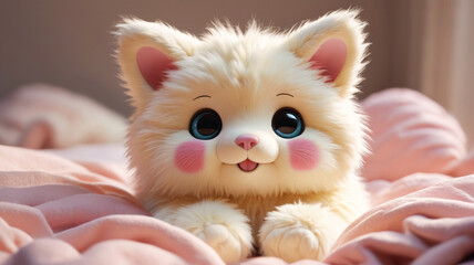 The fluffy sheep sits calmly on a soft surface, showcasing its thick, curly wool. This adorable sheep provides a peaceful presence in the serene and quiet setting.