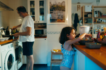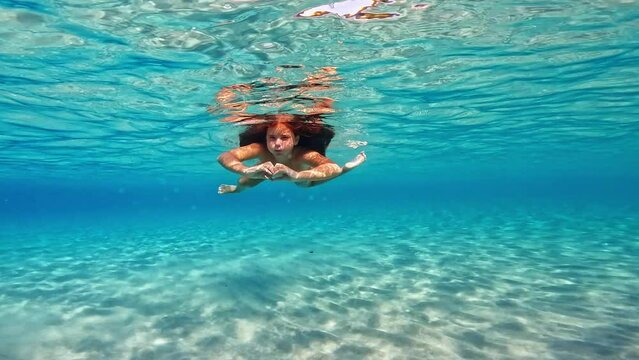 Underwater scene of little girl swimming and doing heart gesture with hands in turquoise tropical sea water of exotic island. Slow motion