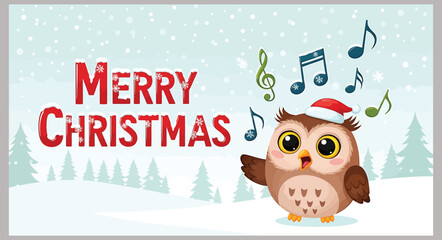 Adorable owl in Santa hat singing merry Christmas music snow forest scene festive holiday vector