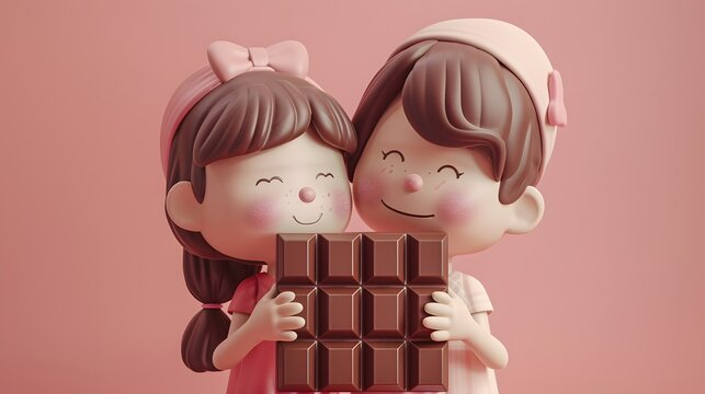 Adorable clay figures of two children sharing a chocolate bar, set against a soft pink background. Perfect for love and friendship themes.
