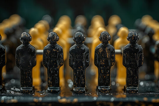 Illustration of a foosball table designed as a sleek, modern sculpture with players carved from polished metal, resembling abstract human figures,
