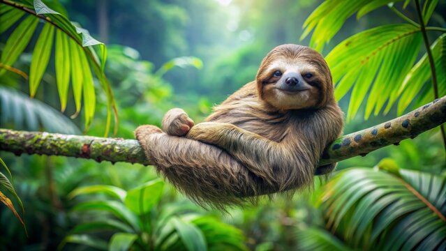 A lazy sloth resting on a branch in the lush rainforest, sloth, rainforest, wildlife, tree, animal, nature, relaxation, slothful