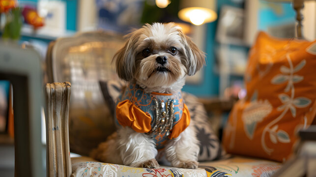Adorable Shih Tzu in Decorative Orange Outfit Relaxing on a Vintage Chair in a Cozy Home Setting