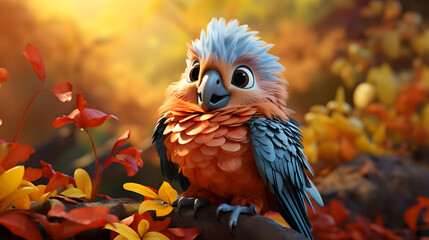 Cute cartoon owl with big eyes, fluffy feathers. Adorable bird features playful design in grey, pink tones, set against simple pink background. 3d render style makes charming character for whimsical