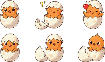 Cute cartoon baby chicks hatching from eggs, adorable yellow birds, Easter illustration, spring newborn animal vector art design