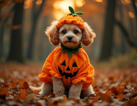 Adorable poodle puppy wearing orange pumpkin costume round fabric body green stem hat small dog halloween costumes pet photography ideas toy dog costumes blurred background with halloween costumes cos