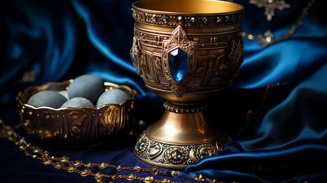Golden chalice and freshly baked loaf of bread centered on a vibrant, ethereal backdrop, evoking a sense of reverence and spirituality, symbolizing Holy Communion.