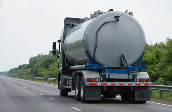 Isothermal Tank truck driving on highway. Oil and Gas Transportation and Logistics. Metal chrome cistern tanker with petrochemicals products. Liquid Chemical Freight