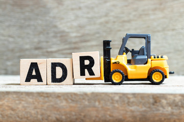 Toy forklift hold letter block r to complete word ADR (Abbreviation of Adverse drug reaction) on wood background