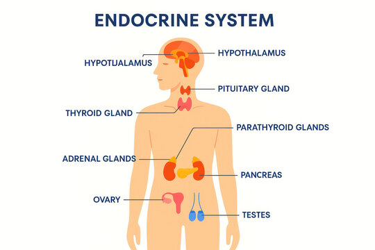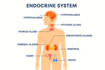 Comprehensive infographic on the human endocrine system, illustrating major glands such as the pituitary, thyroid, and adrenal glands with writing space and open area for educational content