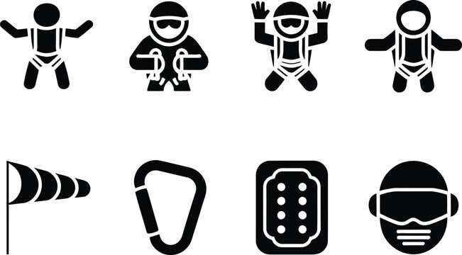 Adventure sports icons: parachute, snowboard, bicycle, skateboard, rock climb graphics