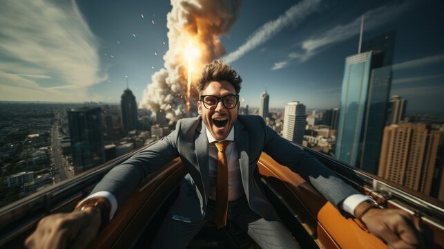 Thrilled businessman in a suit screaming with joy on a wild roller coaster ride in the city