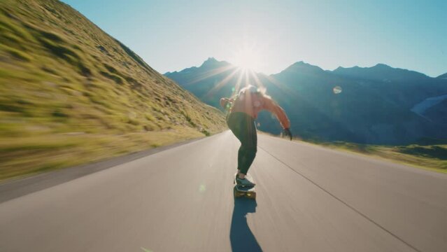 Cinematic downhill longboard session. Young woman skateboarding and making tricks between the curves on a mountain pass. Concept about extreme sports and people
