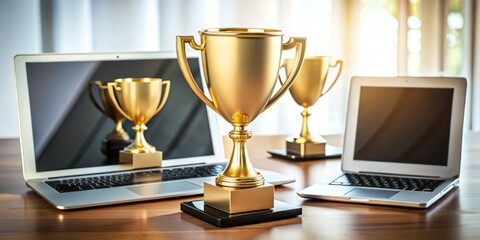 Golden trophy surrounded by sleek laptops, tablets, and smartphones, symbolizing success and achievement in the digital