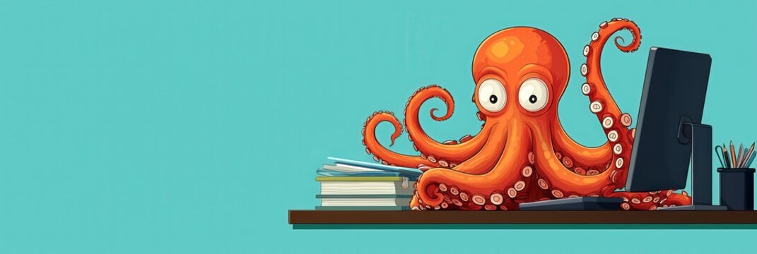 This cartoon-style illustrated octopus, placed behind a desktop, exudes cheerfulness and creativity, potentially symbolizing multitasking and adroitness in daily tasks.
