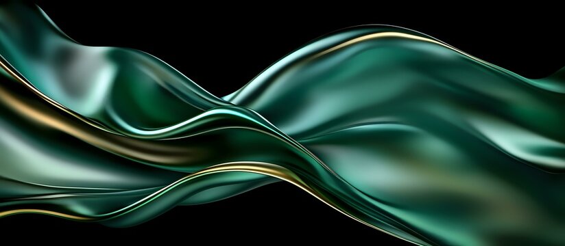 Luxurious emerald green silk fabric waves with golden accent on black background, flowing in smooth elegant curves creating abstract artistic composition.