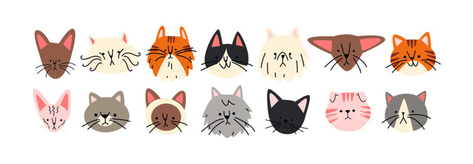 Cats heads in groovy style 90s. Set pets in cartoon funny kittens characters in retro style. Animals icon avatars veterinarian zoo stickers