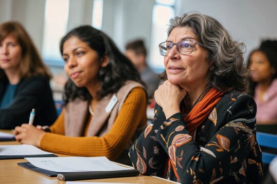 A group of adult learners engaged in a seminar, exchanging ideas and insights as they strive to expand their knowledge in a professional development setting.