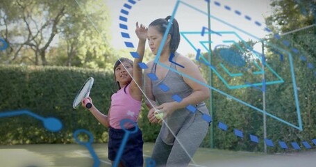 Coach guiding girl's racket on tennis court, releasing ball, practicing swing, AR overlay tracing