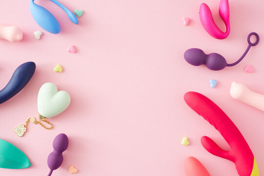 Concept of adult toys for sexual satisfaction. Top view of vibrator, vaginal balls, dildo, clitoral stimulators and hearts on pastel pink background with an empty space for text or promotional