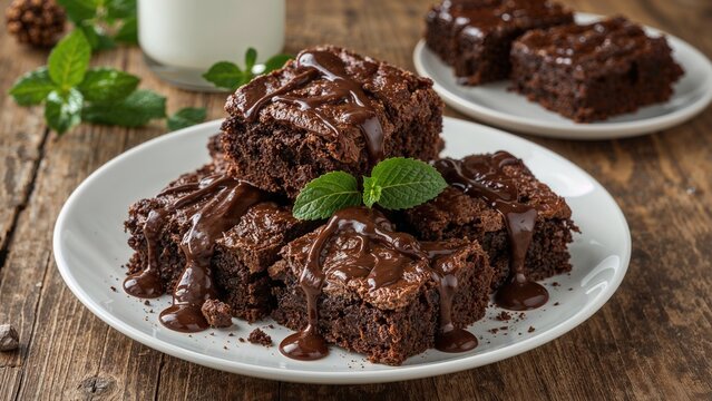 Rich chocolate brownies with melted chocolate on top, served on a white plate. Delicious homemade dessert, perfect for a sweet treat.