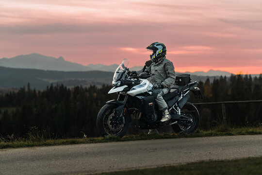 Close up of motorcycle riding through water crossing in green forest in Colorado