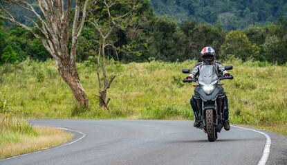Outdoor image of blank huge billboard standing near road on way to mountains having many evergreen trees around sides of green divided by paved road amazing landscape Copyspace for adv : Generative AI