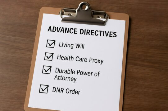 Advance directives checklist including living will, health care proxy, durable power of attorney, and DNR order, ensuring end of life care preferences are documented