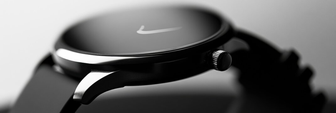 Close-up of a modern smartwatch showcasing a clean monochrome watch face with sleek design in a high-tech setting