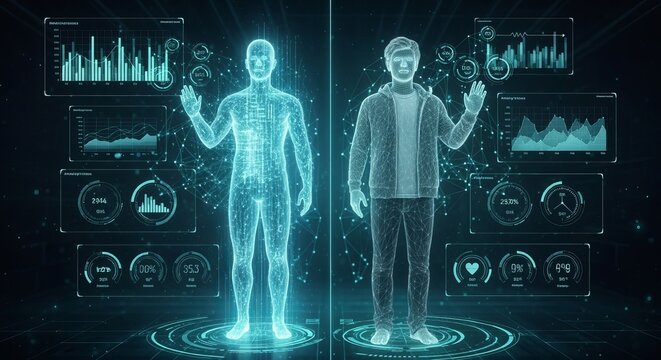 Human digital avatars with data analysis, representing the future of personalized medicine and healthcare technology, showcasing advanced diagnostics and patient monitoring on transparent background