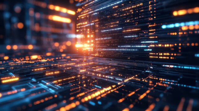 Advanced encryption standard visualized as a glowing, complex code pattern, sharp and sleek cyber environment