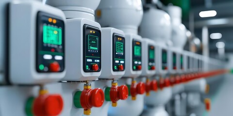 The image showcases a row of advanced digital meters, featuring screens and control knobs, likely used for monitoring and controlling various systems.
