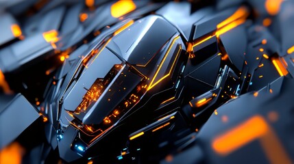 Glowing orange hexagonal nanotech structure on blue circuit board, futuristic quantum computing and advanced material science concept