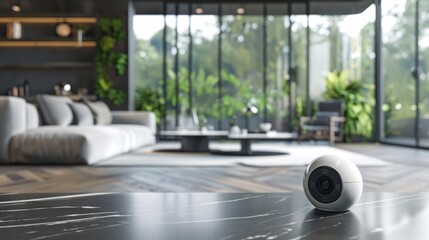 Modern living room with smart security camera on a marble surface. Home surveillance technology. Concept of safety, smart home, interior design, contemporary lifestyle
