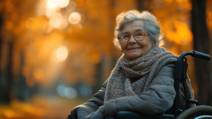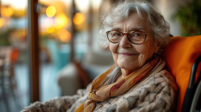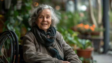 80 years old woman smiling bright in the camera sitting in a hypermodern wheelchair
