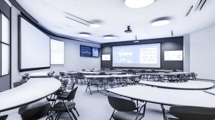 A futuristic AI-driven smart classroom with interactive learning tools, modern educational environment with advanced digital displays and personalized educational content, Educational style