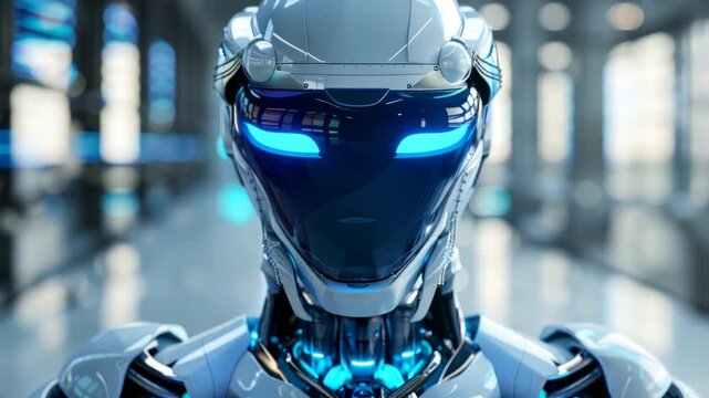 A highly advanced robot stands majestically in a modern high-tech space, showcasing its striking glowing blue eyes and sleek metallic surfaces, symbolizing innovation