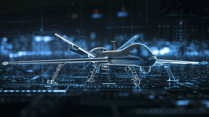 Futuristic military drone wireframe model with digital interface elements and holographic display technology for advanced warfare simulation systems