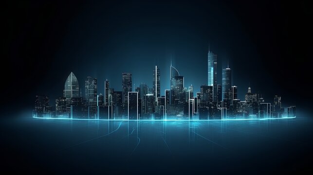 An isolated smart city on a dark blue background, featuring intelligent infrastructure. This futuristic cityscape showcases IoT, 5G and AI integration with copy space for added context. Generative AI